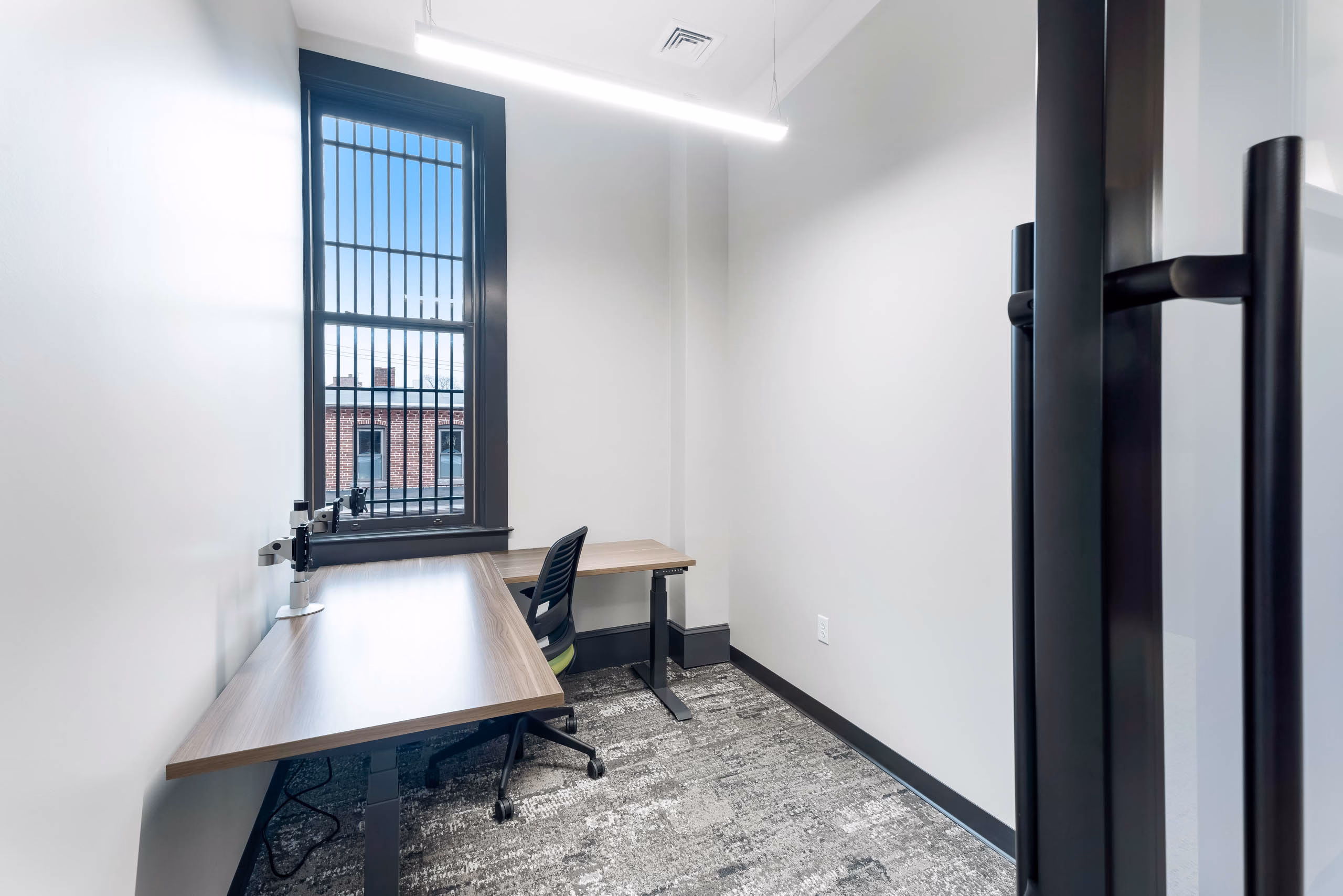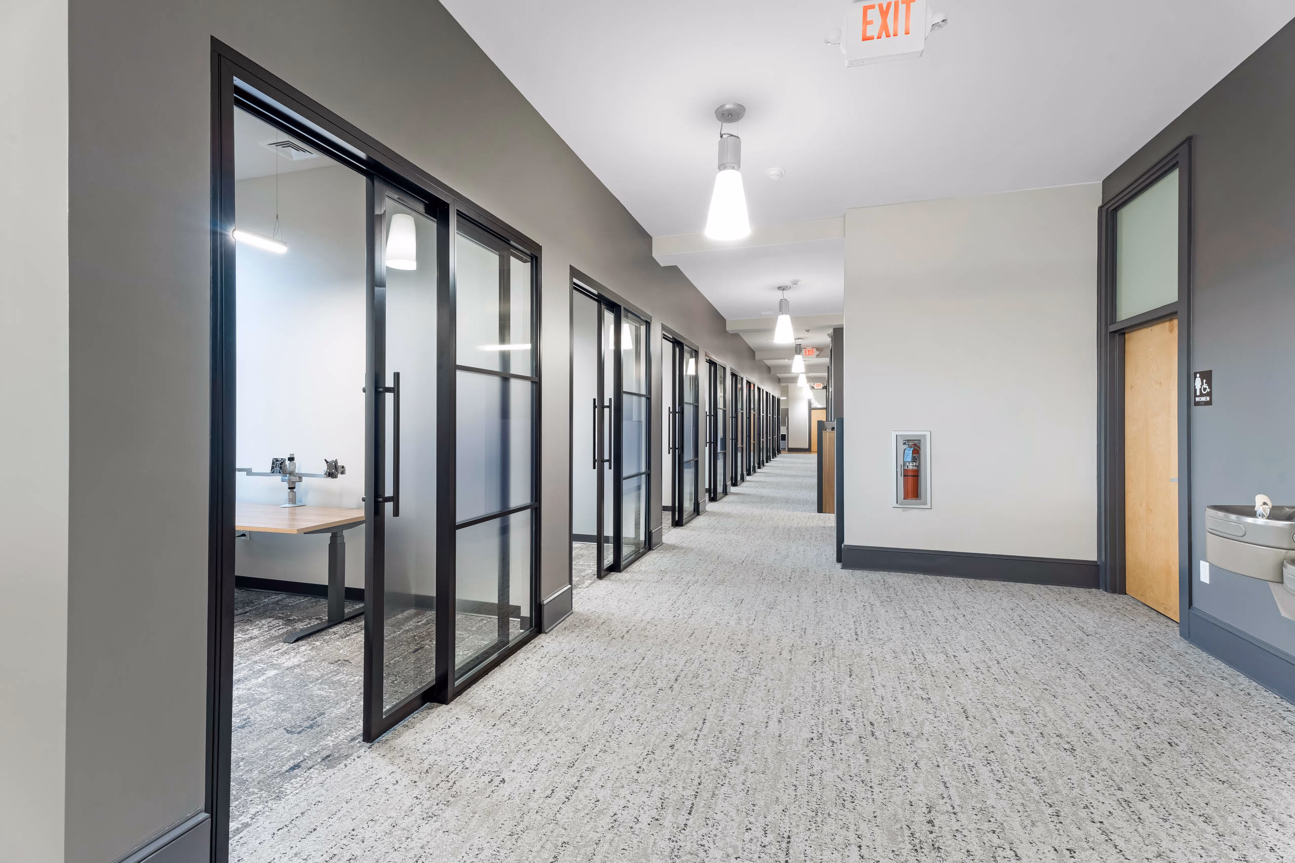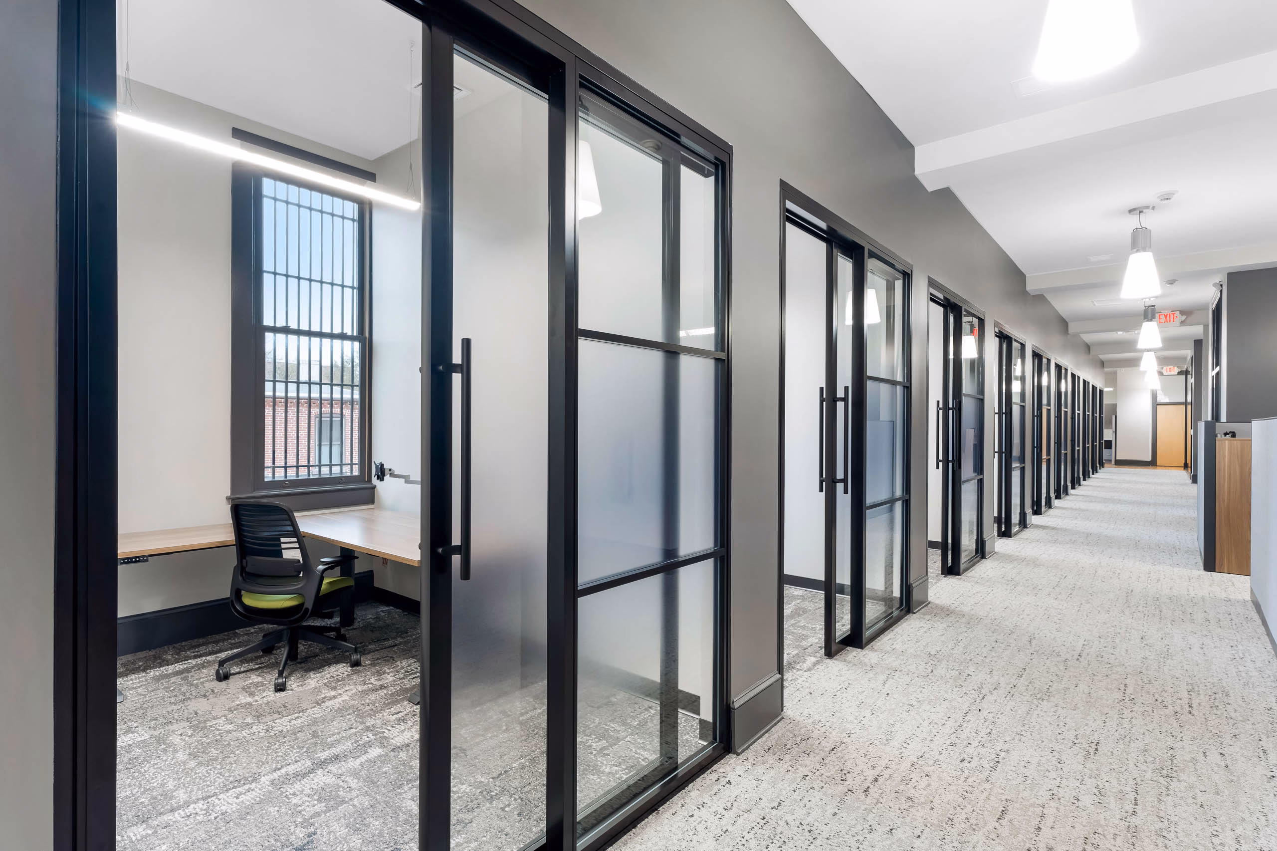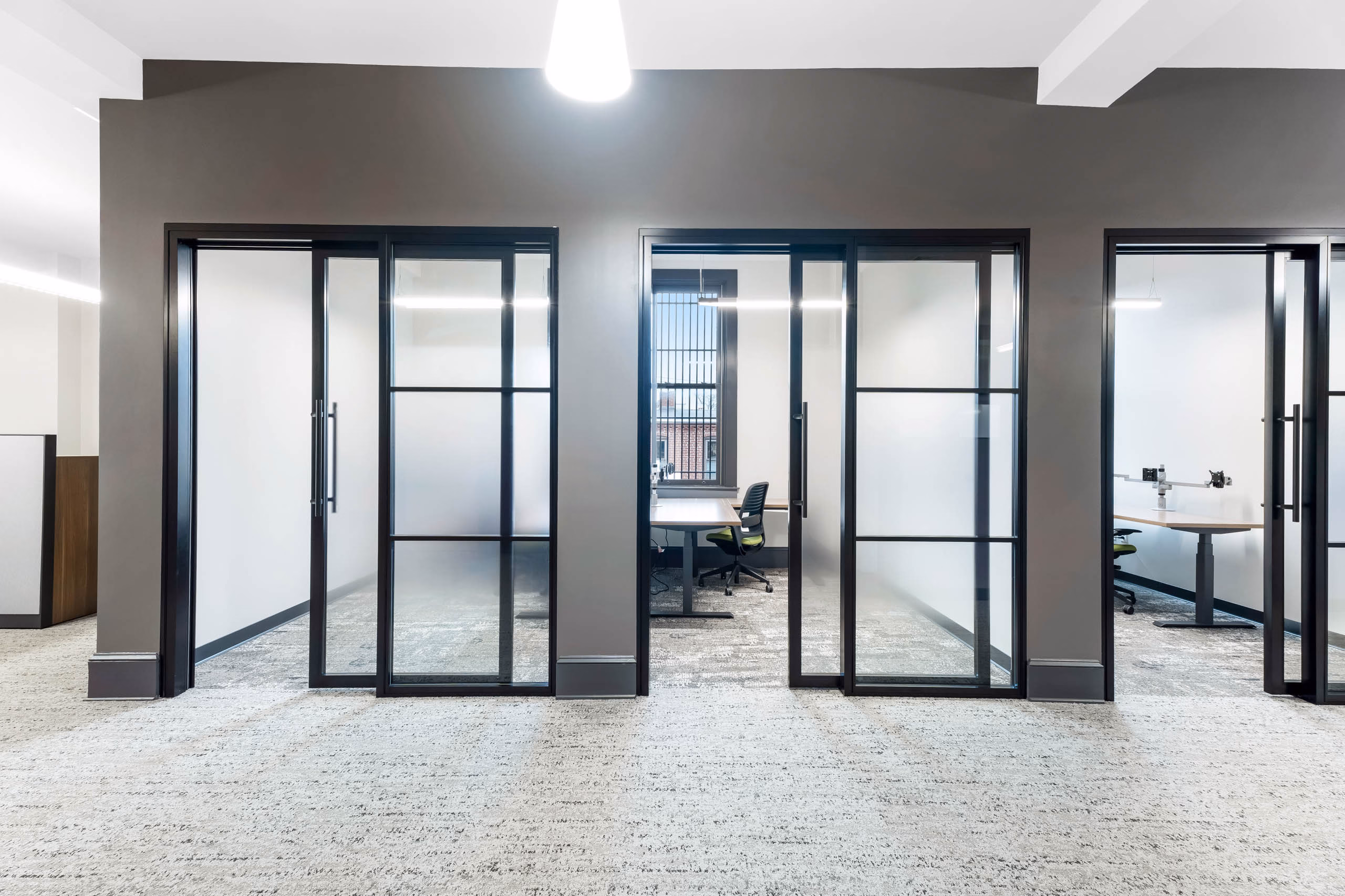 - Rolling Glass Privacy Doors – Trout’s private office features large, rolling glass doors that are not only functional but offer a sleek, upscale look.