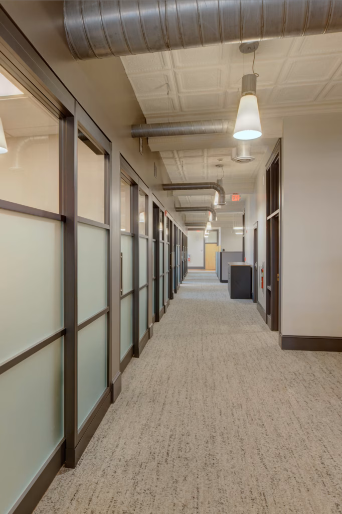 Phase 1 of the project was completed in 2020. It was a total renovation of the building’s first and second floors. The scope included removing existing office walls and floors and installing new offices, bathrooms, casework, flooring, lighting, and paint.