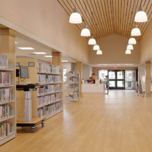 The library has now tripled in size from its former location in a municipal building, adding parking and state-of-the-art communications, a teaching kitchen and a center courtyard. The community is providing the space to the library free of charge.