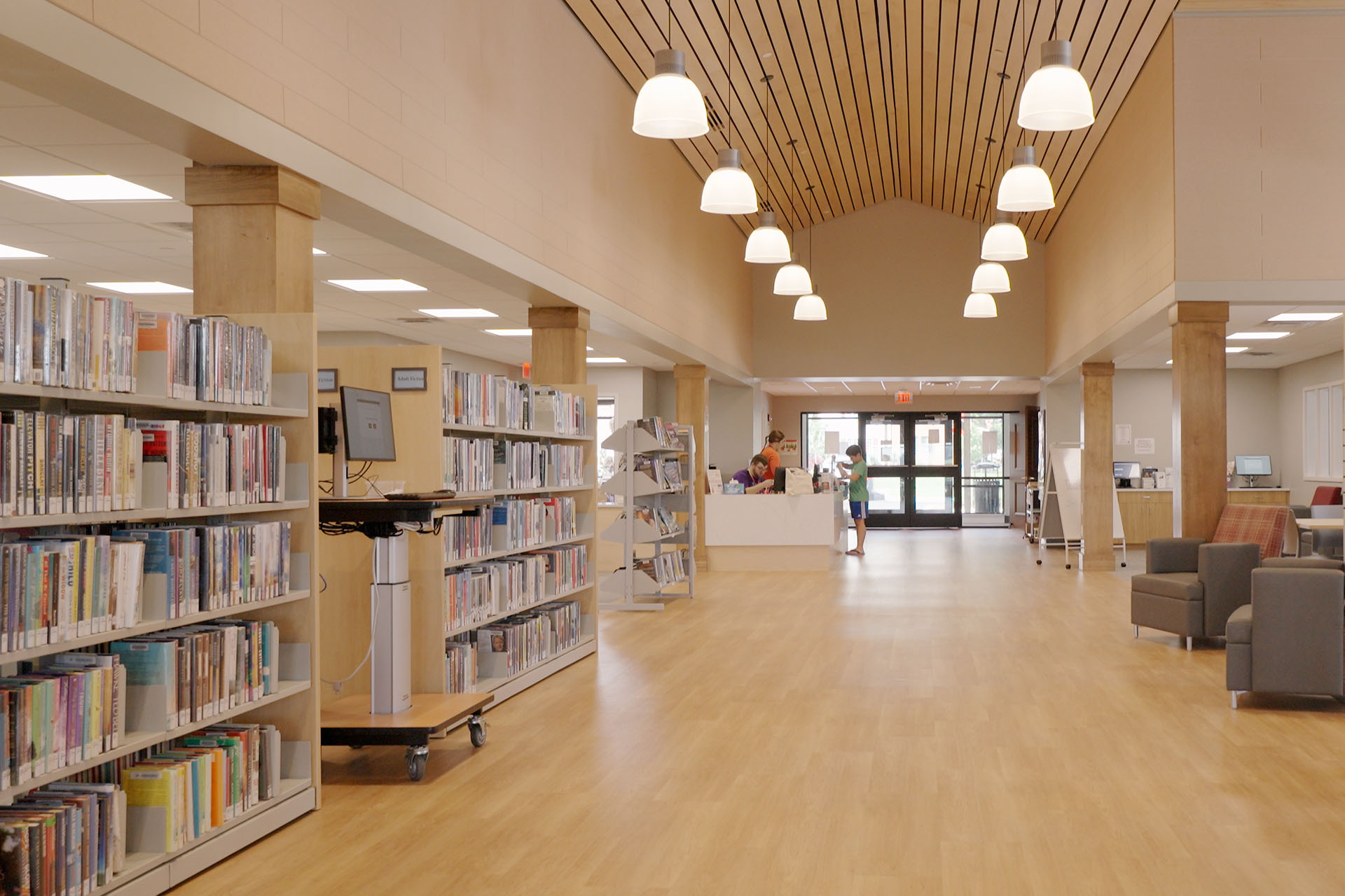 The library has now tripled in size from its former location in a municipal building, adding parking and state-of-the-art communications, a teaching kitchen and a center courtyard. The community is providing the space to the library free of charge.